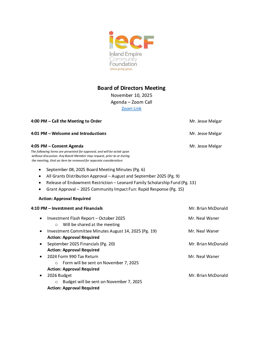 Board of Directors Meeting Agenda – November 10, 2025 – UPDATED